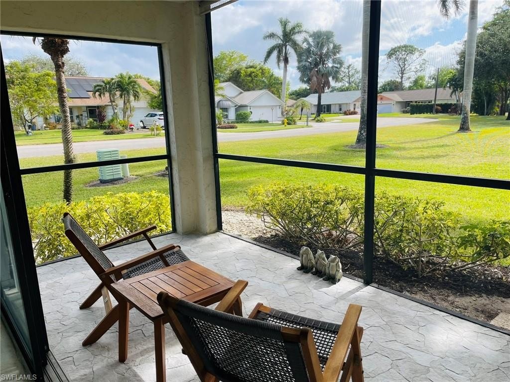 This condo is on the first floor and is a well-positioned end unit on the edge of the development, providing extra privacy and more expansive views of the landscaped areas. The lanai faces the well-manicured grounds and one of the two pools on property. Access to the pool is just a few yards from your backdoor!! The spacious owner's suite features direct lanai access. The en-suite bathroom is equipped with a step-in shower, dual sinks, and a spacious walk-in closet. The kitchen has a pantry, a built-in desk, and a sizeable breakfast nook which is also perfect for a den or home office. The entrance has a large patio with plenty of space for a table and chairs. Fountains V, set in a serene neighborhood, offers well-maintained grounds, two community pools, and a variety of social activities, all with reasonable association fees that cover cable and water. Its prime location features access to many conveniences including the Hibiscus Golf Course just a block away, proximity to US 41 and the Shoppes at Hammock Cove within a mile, and it's only five miles from downtown Naples, renowned for its pristine beaches, gourmet dining, and sophisticated shopping.